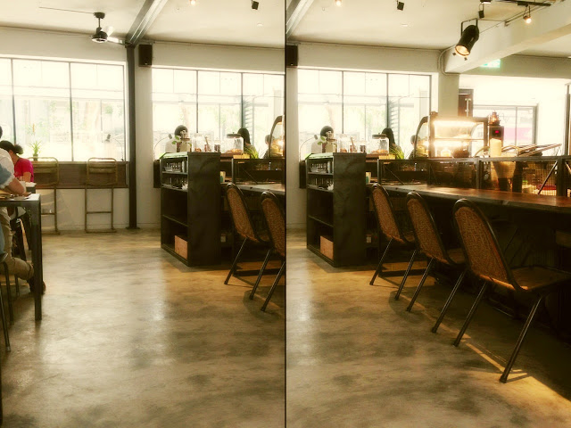進門後右手邊的這一個區塊,有點像是所謂的戶外區,但實際上應該還是算室內空間,因為四面被落地窗所圍起來,我想若是秋天時圍著圍巾坐在這裡喝上一杯熱美式,再舒服不過。 |